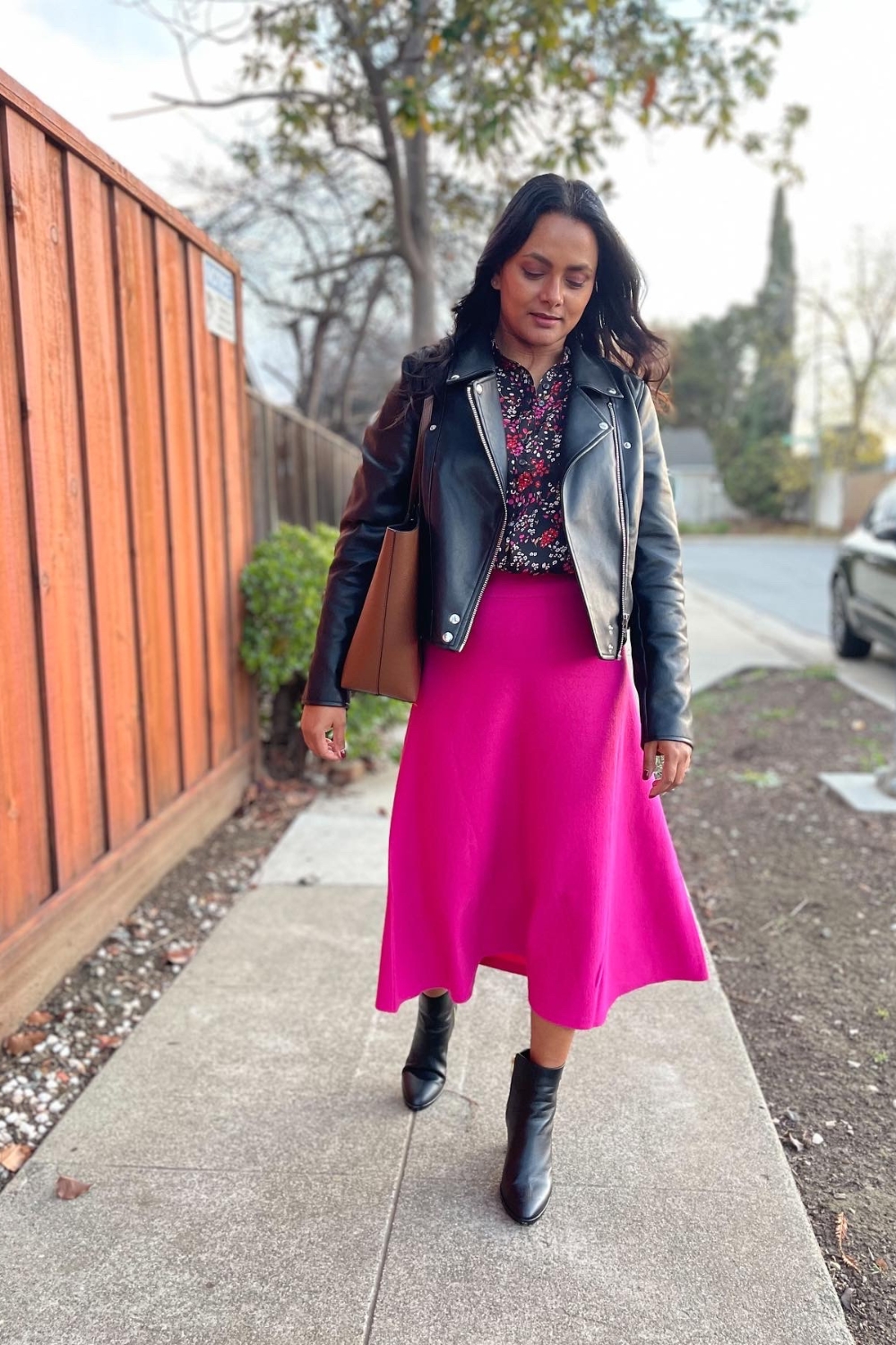When it comes time to wear sweater skirts, you can also pair them with a black leather jacket. I prefer fit and flare style of sweater skirts that look more polished and put together. Now, you can go black for top or pick a printed top which adds some interest to your outfit.