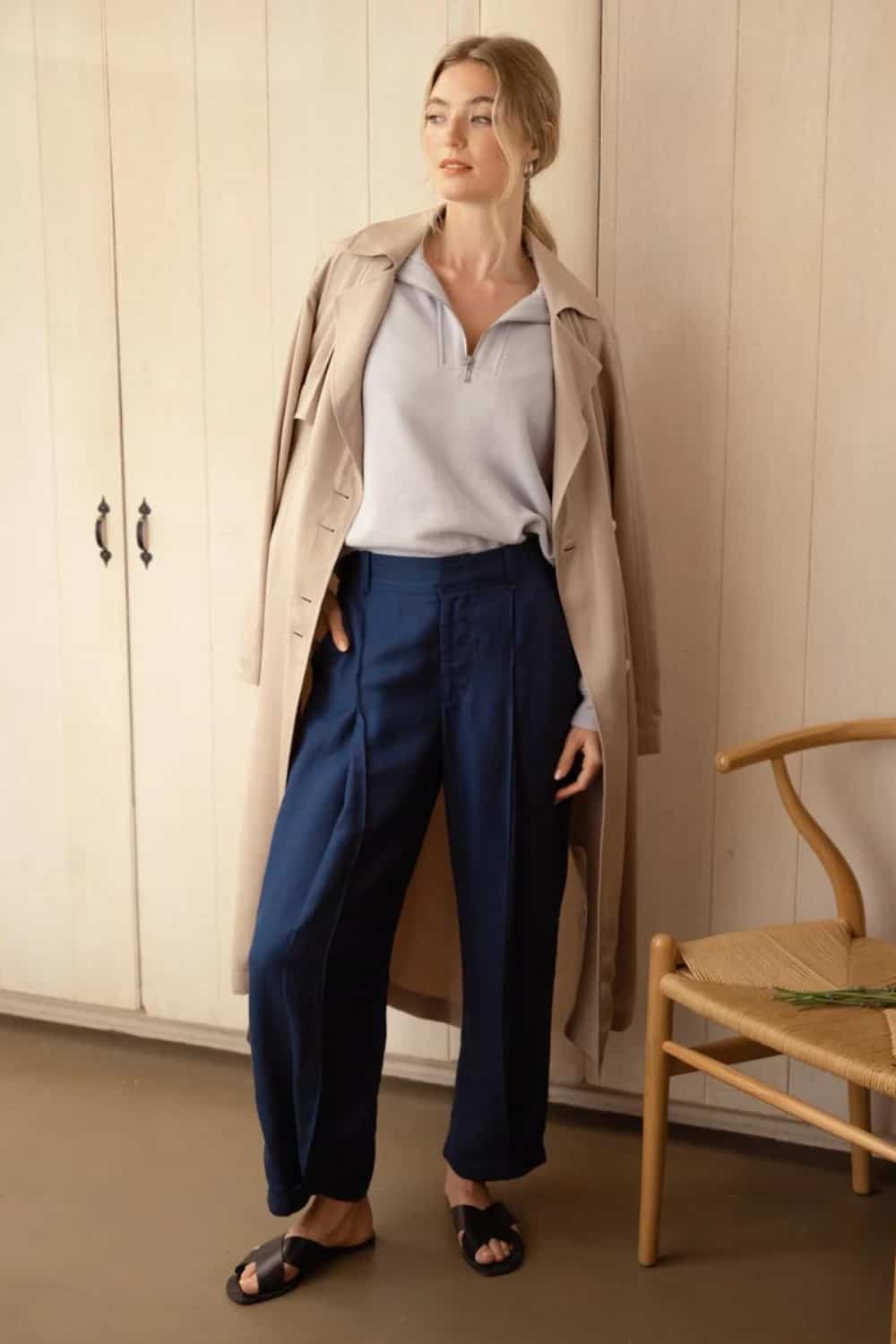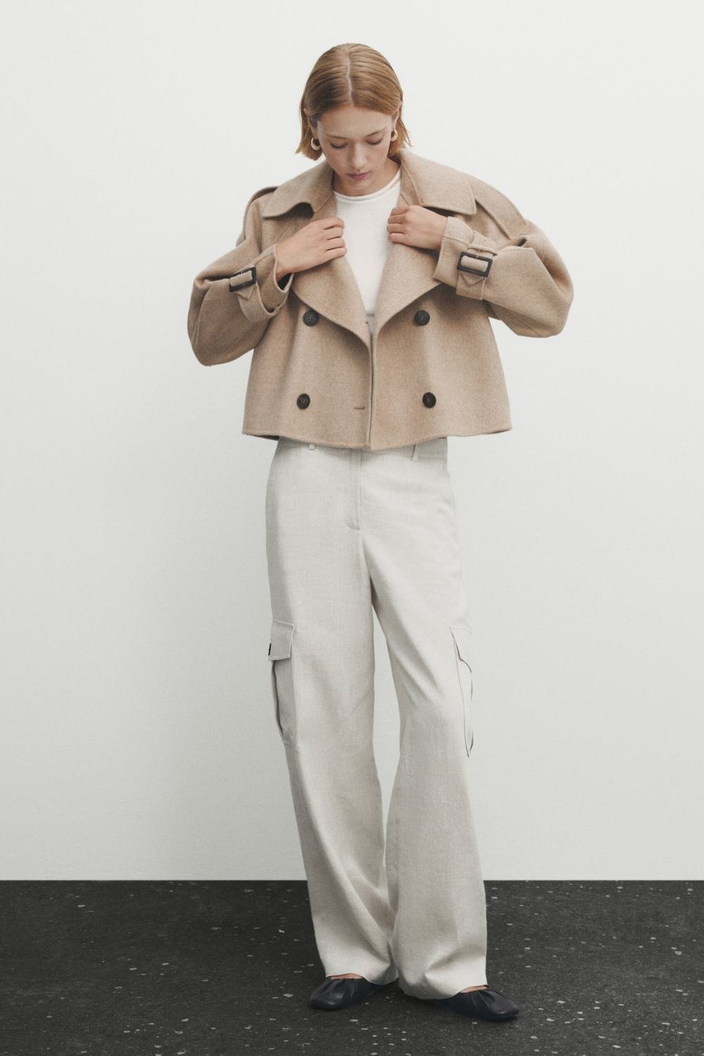 Cropped Trench Coat with Khaki Dress Pants and Plain Top
