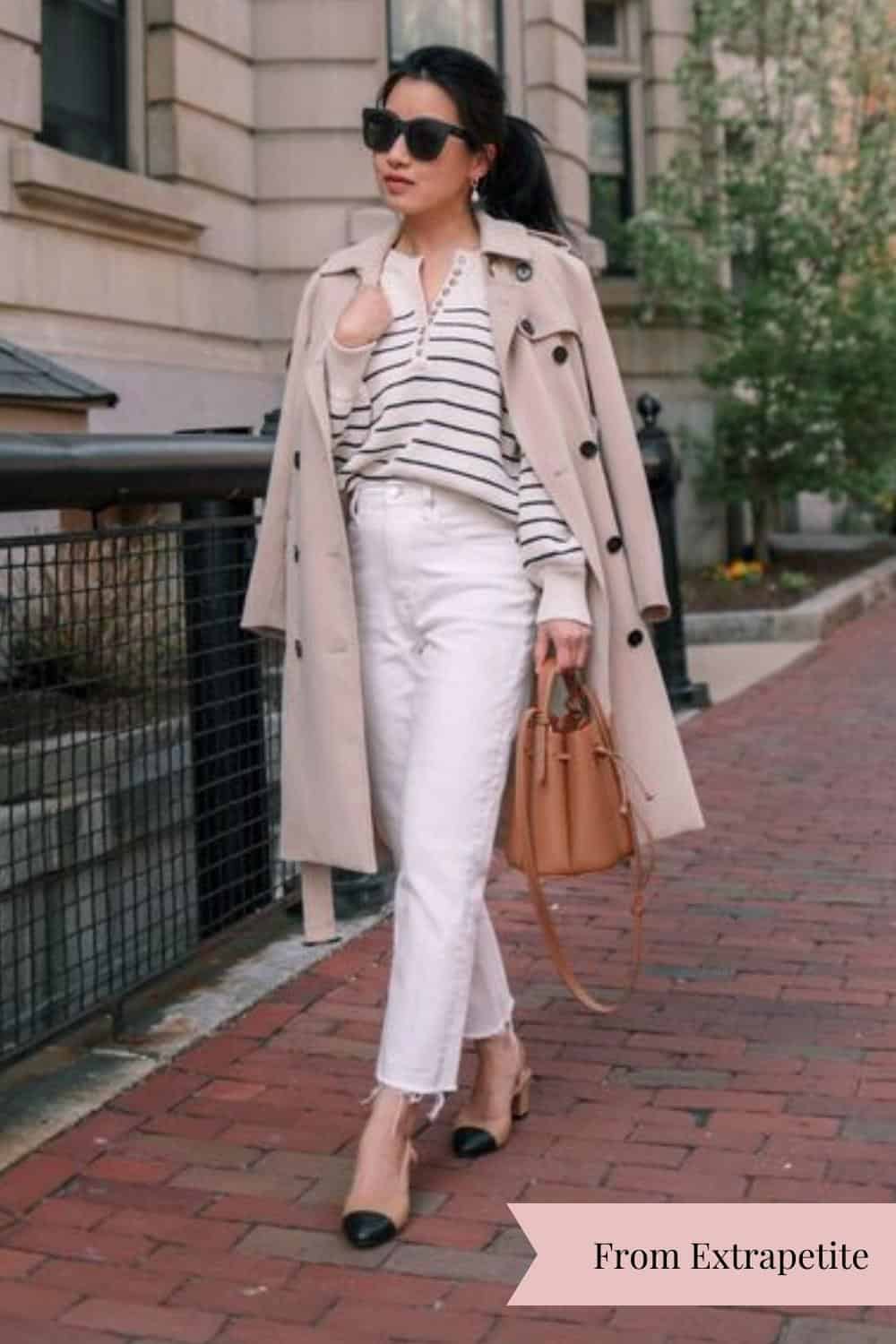 The white and blue combo always looks effortless and stylish. And the trench coat adds structure to the outfit.