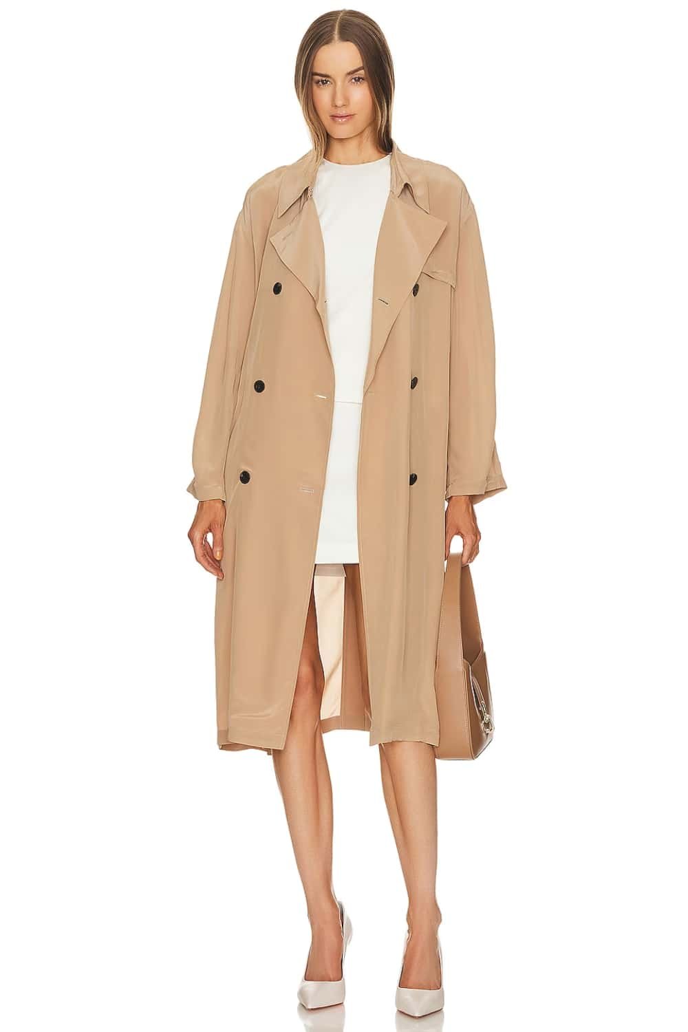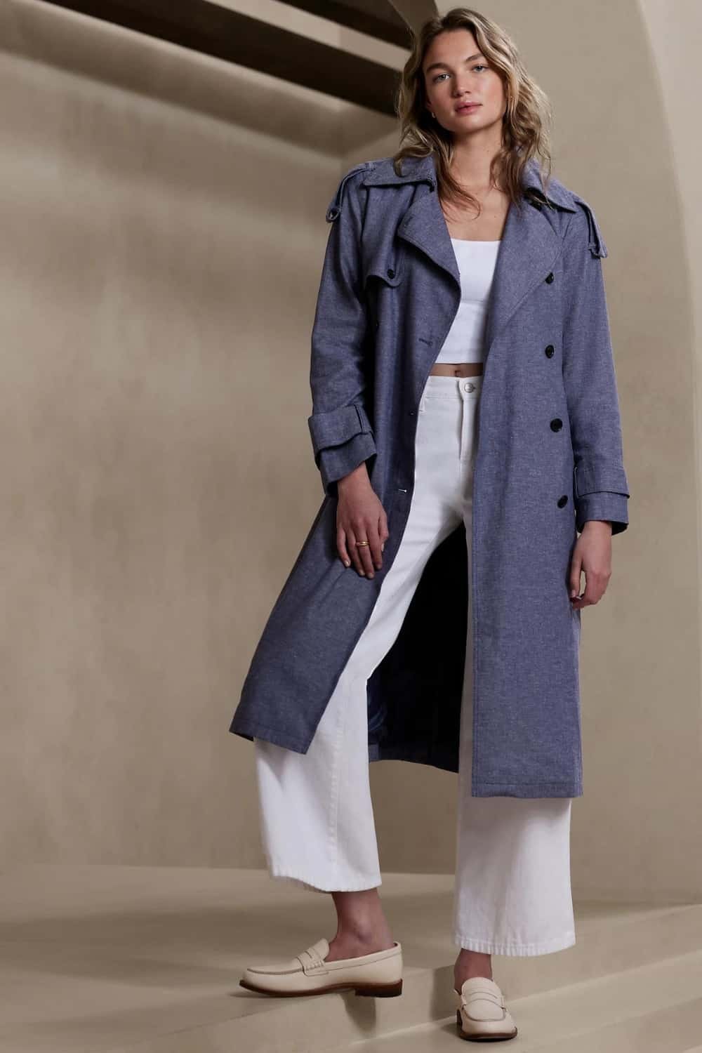 The material is soft like cotton but looks like silk with this airy double breasted trench coat. Fight away the cold fall weather and wear a linen shirt dress and espadrille flats. Bring the whole chic look together with a wrap around belt.