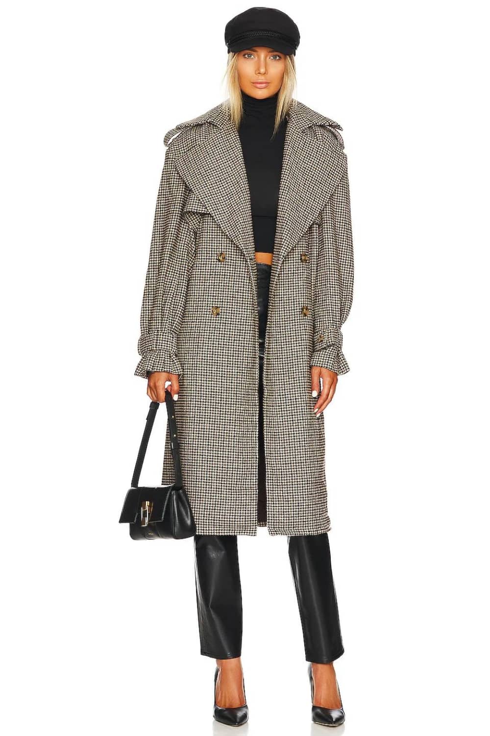 A classic and evergreen style is the plaid and houndstooth patterned trench coat. It adds a touch of liveliness to a low-key outfit. Pair a long length houndstooth wool trench coat like this one with a single color top and black faux leather pants.