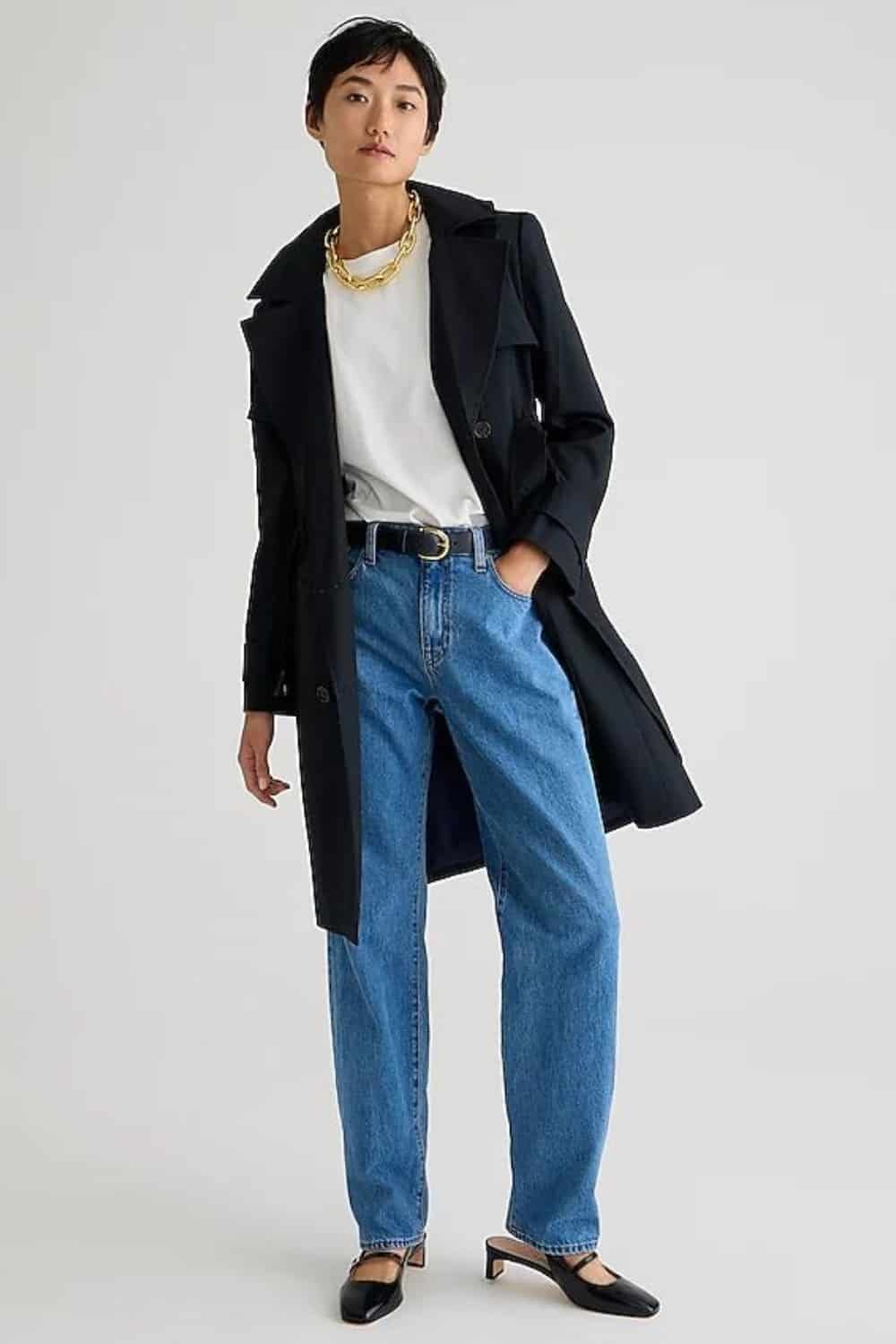 Trench Coat Light Wash Jeans with a Crewneck Sweater
