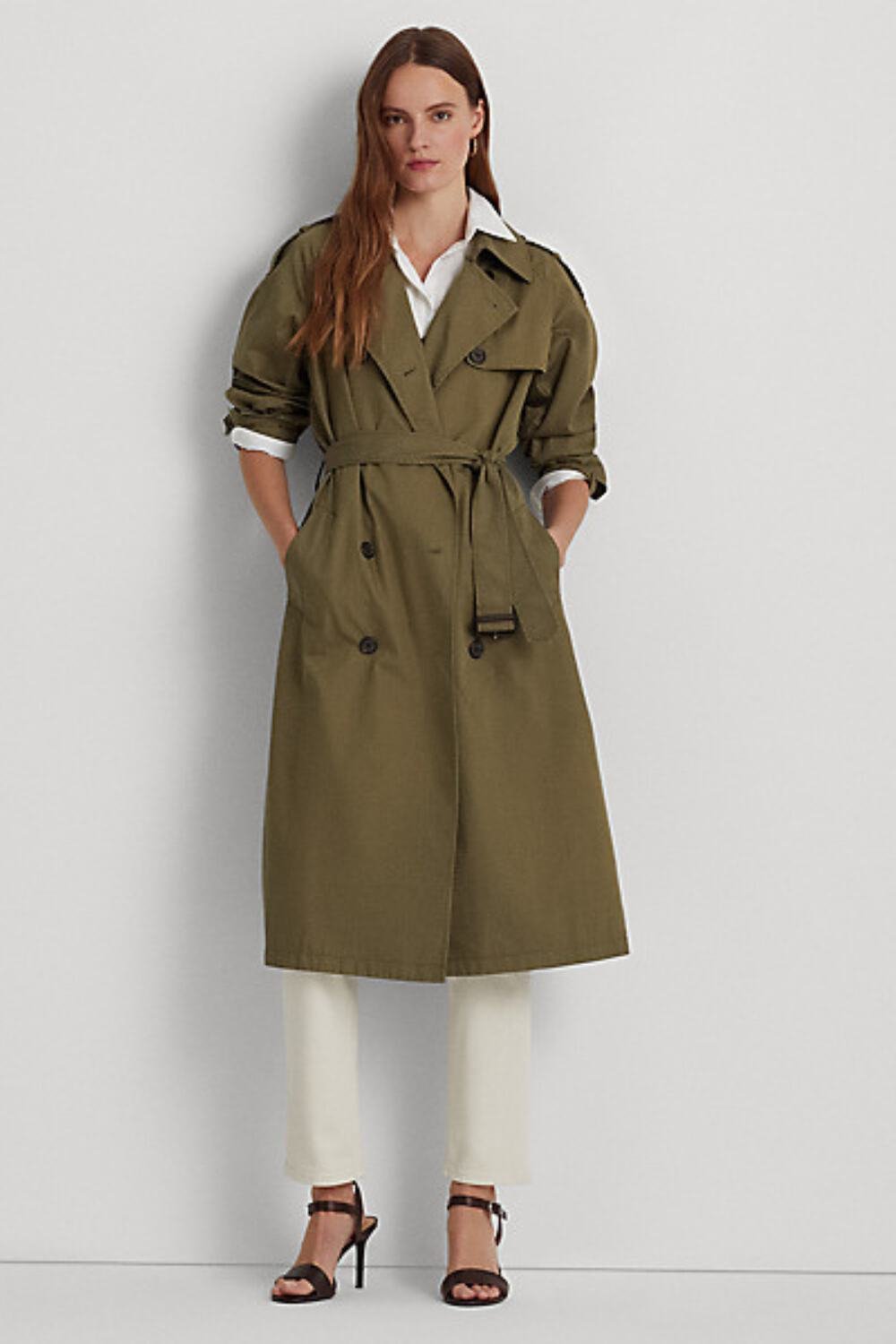 There is a little push and pull with an olive color double breasted trench coat like this one from Ralph Lauren. It is giving detective vibes but still keeping its military-style details. It makes a fashion statement on its own which means it is the perfect match for a white outfit! Pair your favorite polished and comfy white button down shirt, with light jeans or tan dress pants.