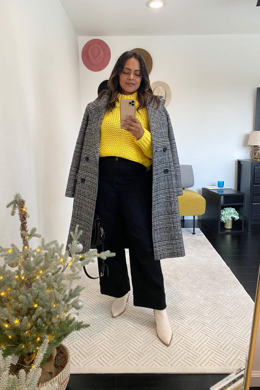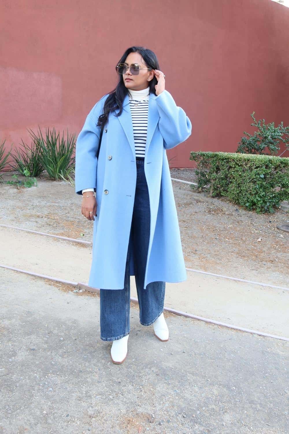 You can do this with almost all shades of wide leg jeans. Match the shade of boots with the color family of the coat.