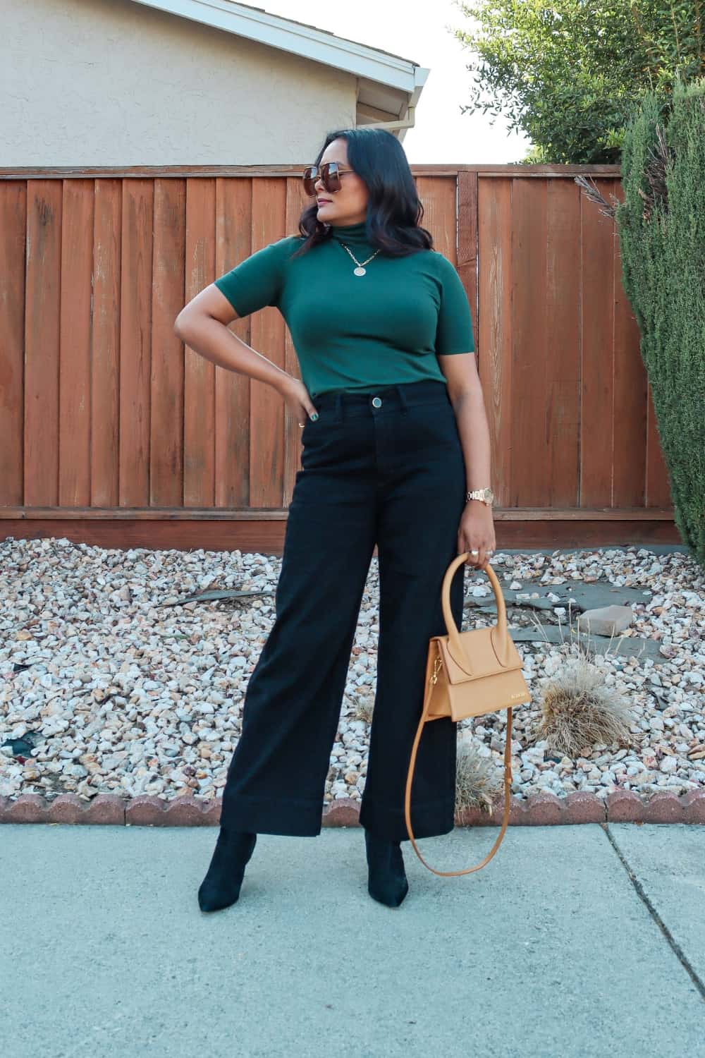 Faux leather puffer jacket is an elevated winter basic that can enhance your everyday outfits. And it’s a great outerwear you can pair with a wide leg jeans. In this black wide leg jeans outfit, we have paired a black Chelsea boots with pointed toe. Even though the Chelsea boots are flat, because of the pointed tow style, it makes your legs look longer.
