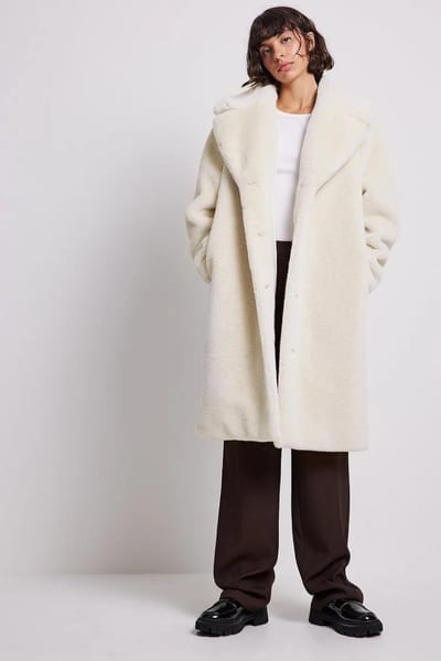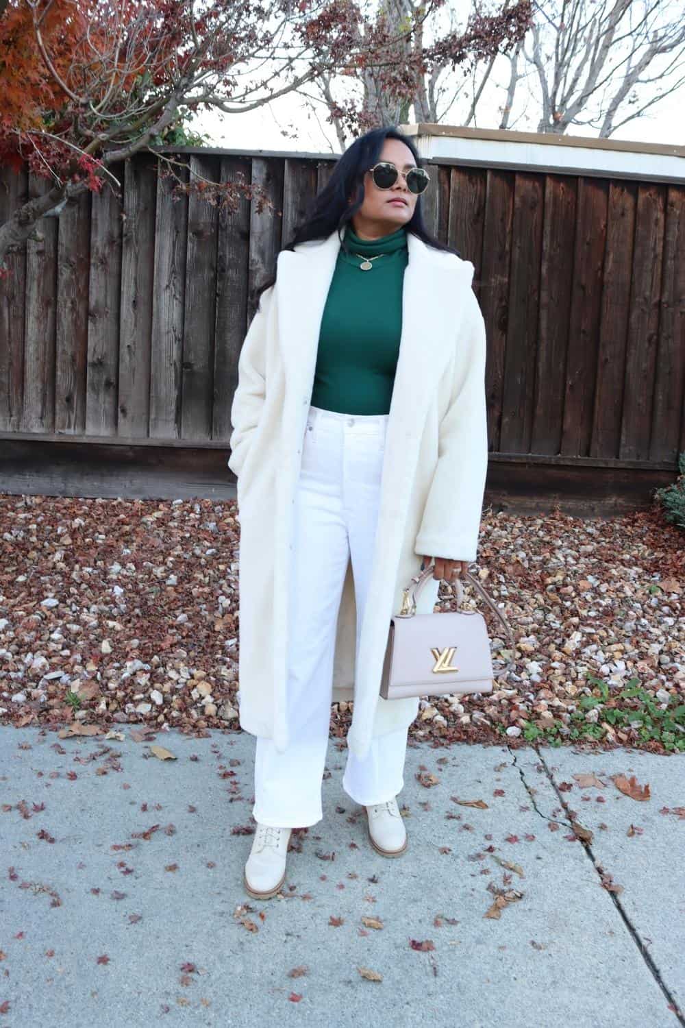 In this white wide leg jeans outfit, we again have a monochromatic look with white jeans and white faux fur coat. A faux fur coat is perfect to create a cozy extreme cold weather outfit. You can pair it with a white jeans to elevate your casual denim outfit.